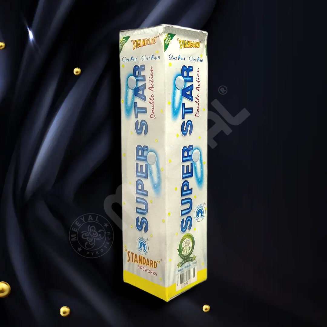 Illuminate your Diwali night with the Super Star Silver Rain, a 1.25-inch fancy comet firework that delivers double-shot silver rain effects. This high-quality night cracker is specially crafted for vibrant silver sparkles that cascade beautifully in the sky. With perfect timing and a powerful visual impact, it creates a breathtaking display ideal for any festive celebration.